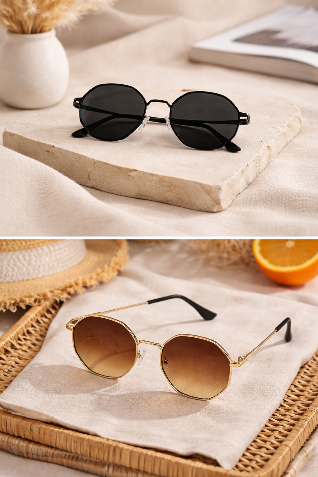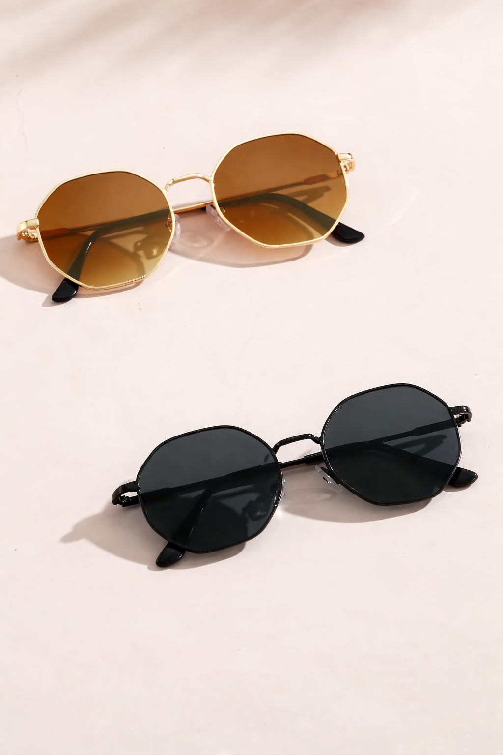 2Pcs Unisex sunglasses set , black and gold Metal Geometric & Round Frame Classical Sunglasses