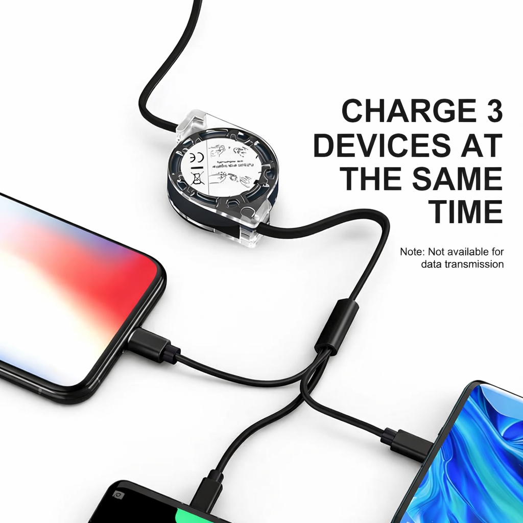 The 3-in-1 retractable USB cable suits a range of devices, offering hassle-free charging for iPhone, USB Type-C Micro Android, Xiaomi, Huawei, and Samsung cell phones.