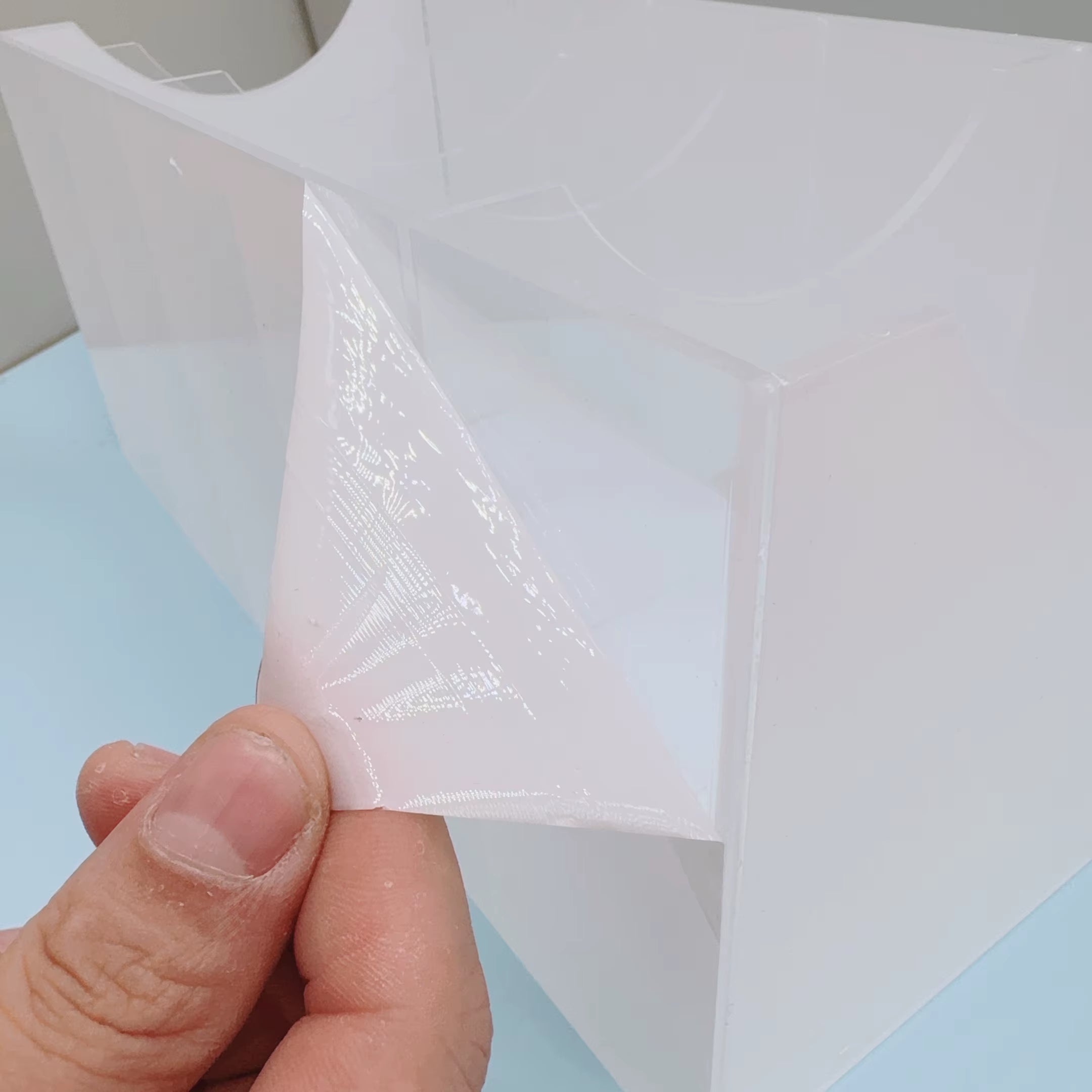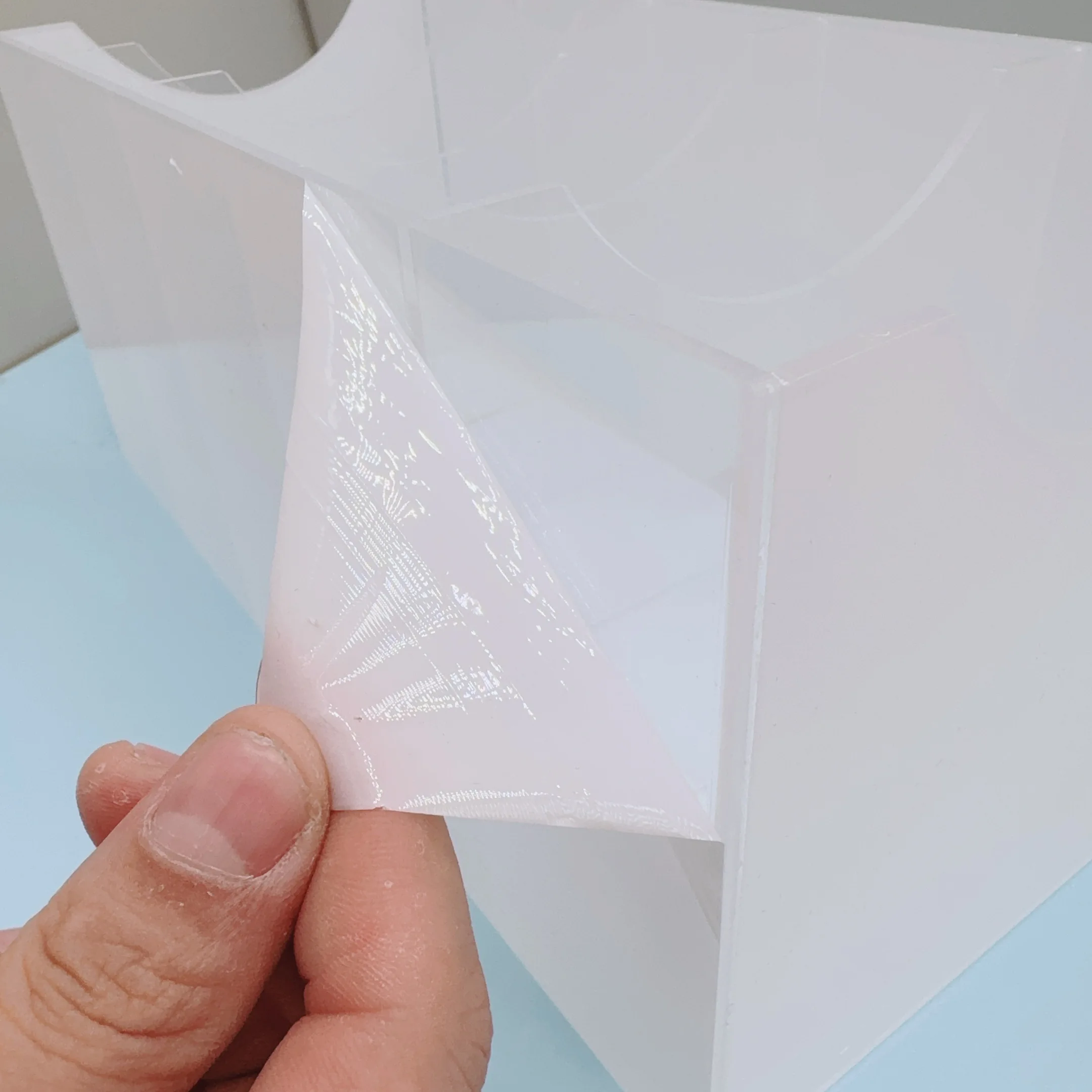 The product is not completely transparent as described in the photo but it is sturdy and made of plexiglass; it arrived in good condition well packed in a box with polystyrene to protect the item.