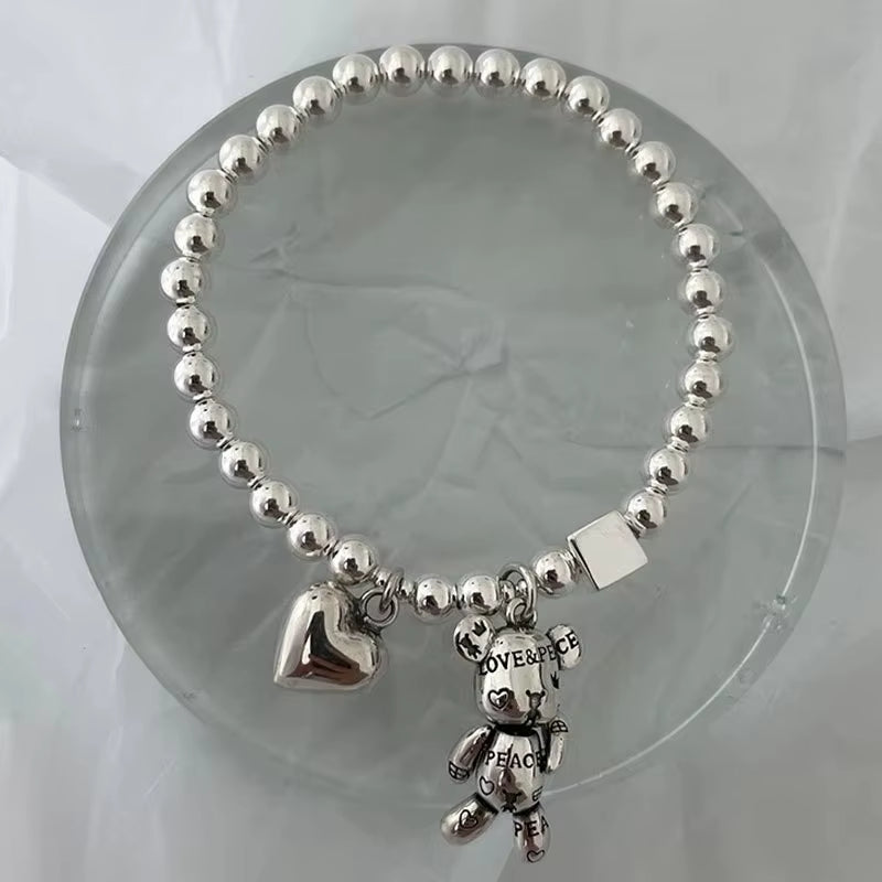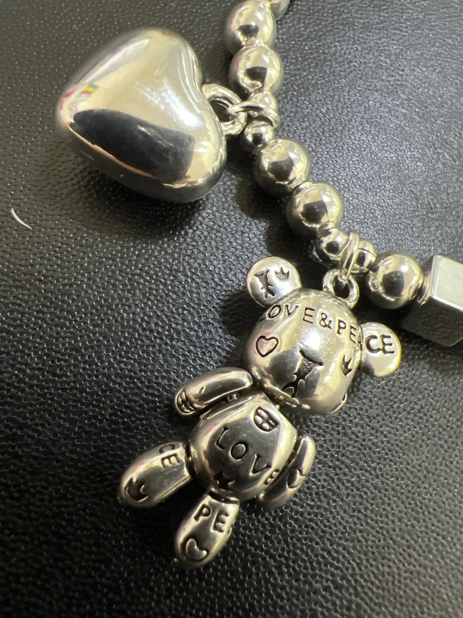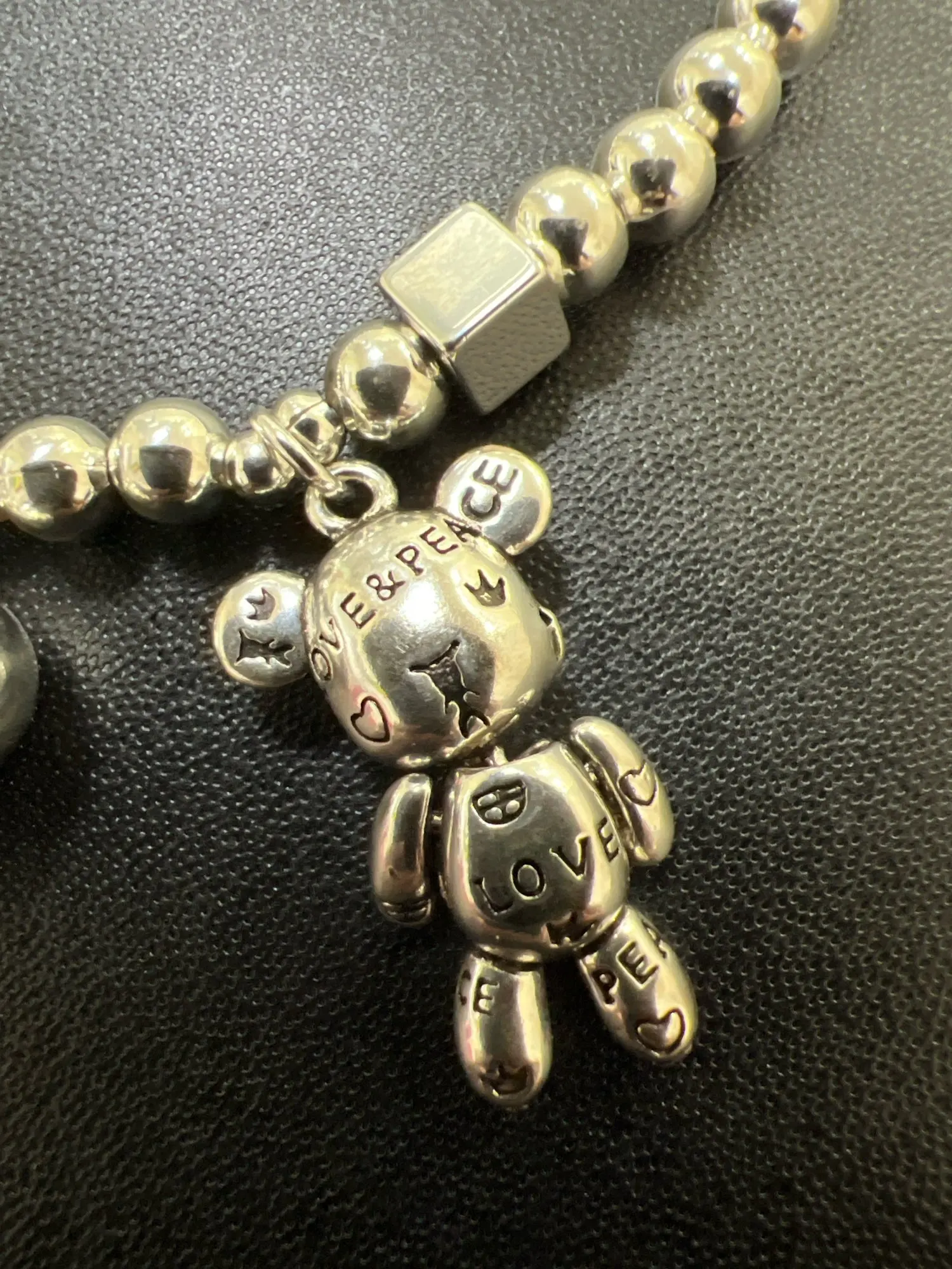 The pearls are plastic on a flimsy string. The teddy bear is just like in the picture, cute.