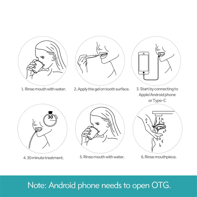 -NO NEED BATTERIES, ENERGY SAVINg Our Tooth Whitening Light with 3 Adapters for iPhone, Android and USB. You can connect with your phone anywhere, anytime. NO NEED for batteries or additional teeth whitening trays. Energy saving and environmental protection. Compatible with any commercial teeth whitening gel or teeth whitening strips, enhance your teeth whitening process faster.^