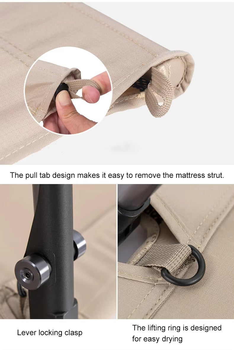 4.Comfort: Cot size is optimal for most people, your arms can stay in the bed without crowded feeling. 3 heavy duty rods strongly support the cot make cot surface flat without sag. 12 anti-skid feet make the bed stable without wobbling. Off ground design keeps you away from hard and wet ground.