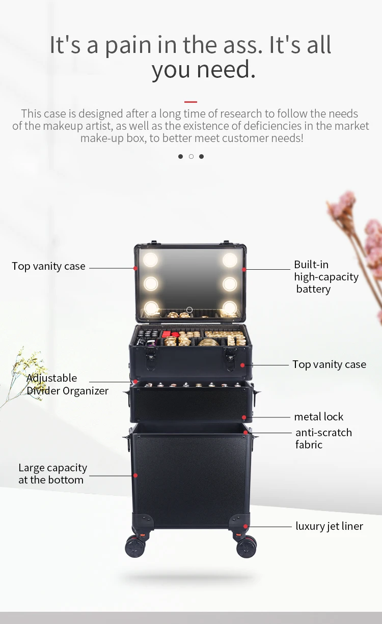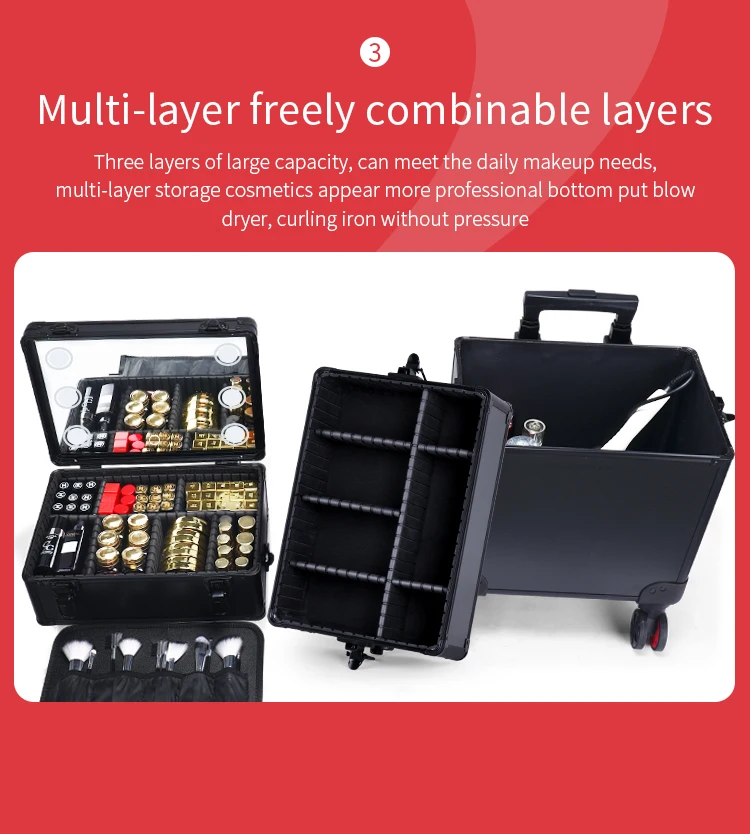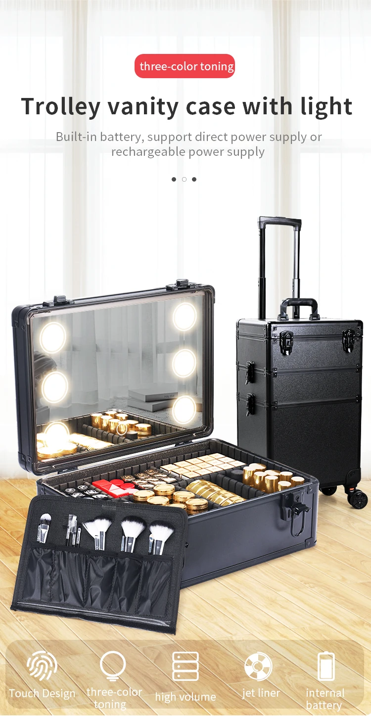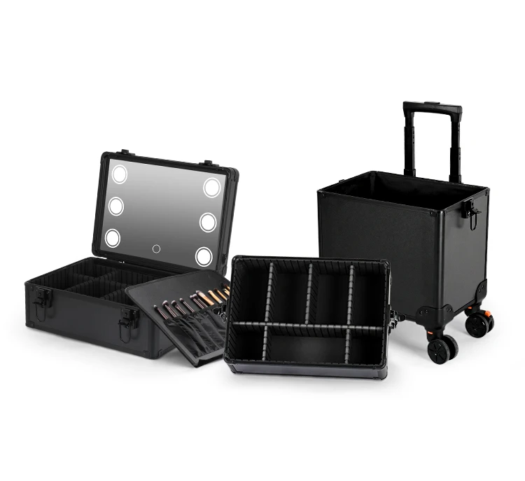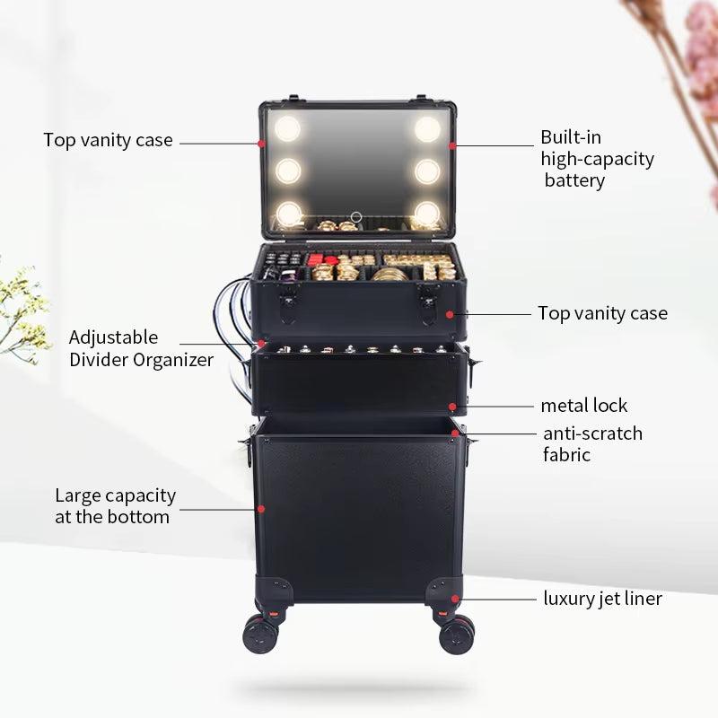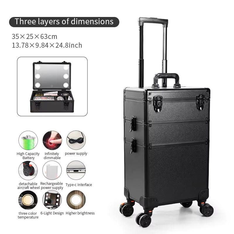 Professional Makeup Organizer Luggage with Led Lights Mriror - Large Cosmetic Trolley, Salon & Barber Case Rolling Cart for Hairstylists
