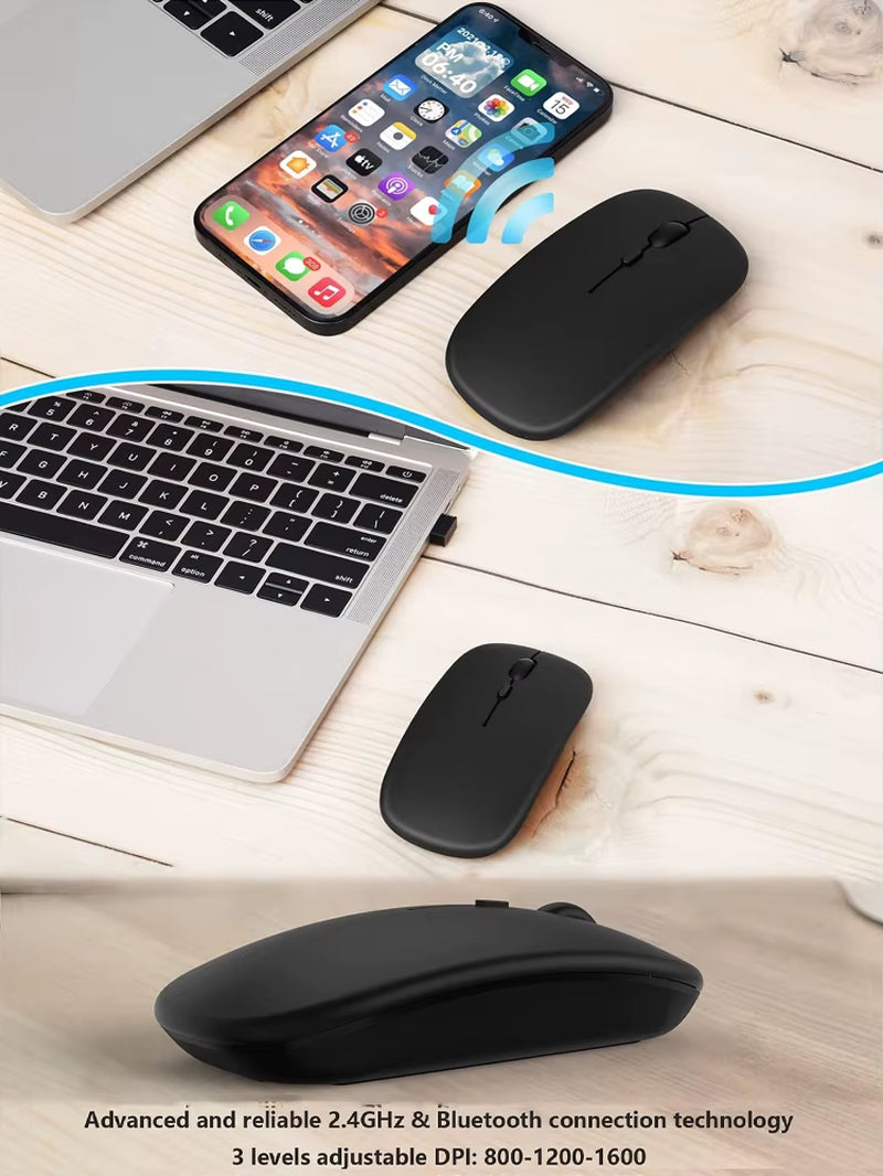 The dual mode wireless mouse realizes switch freely between two devices with one mouse only by simply toggle switching. It can be connected to one device via Bluetooth and to another device via a 2.4GHz USB receiver. Note: Bluetooth mode and 2.4G mode cannot be used at the same time.