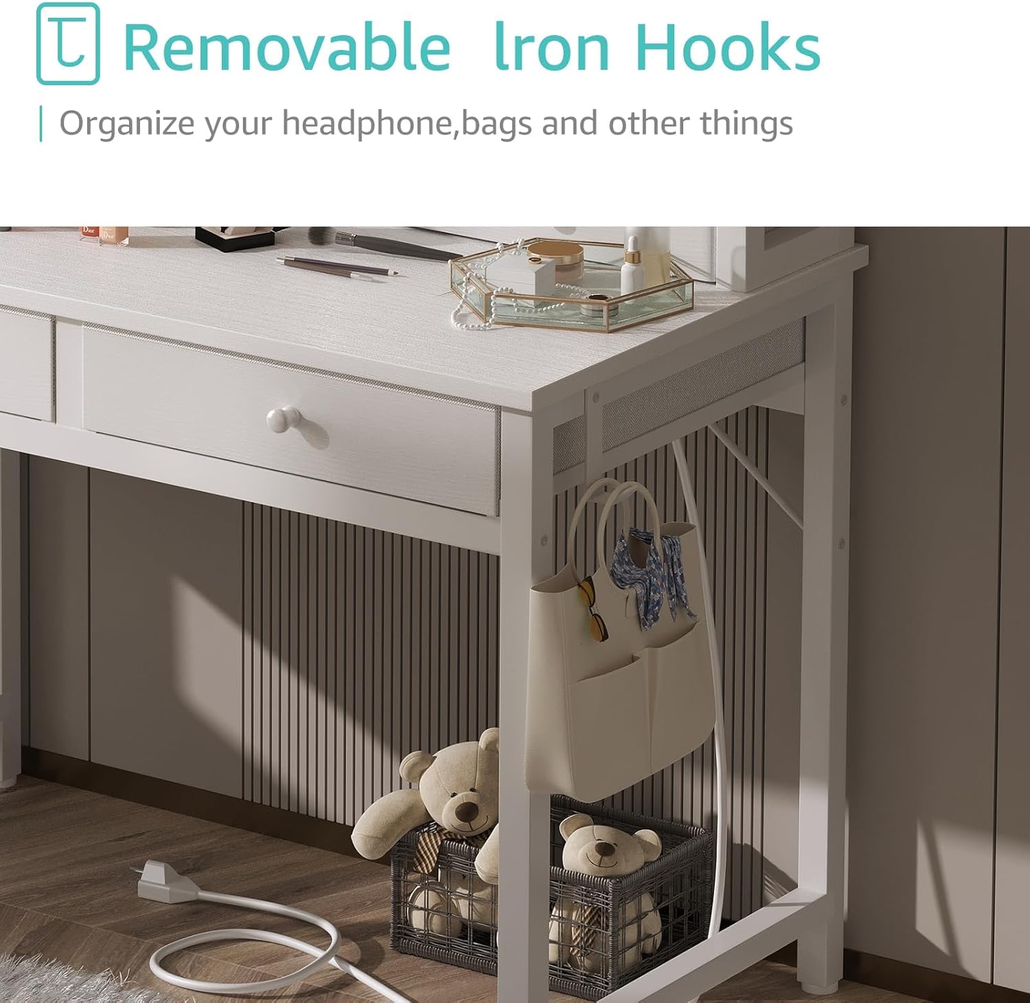 Small White Kids Desk with Fabric Drawers for Bedroom, 32 Inch Vanity Makeup Desk with Drawers Storage for Home Office, Writing Study Table with Power Outlet & Monitor Stand, White