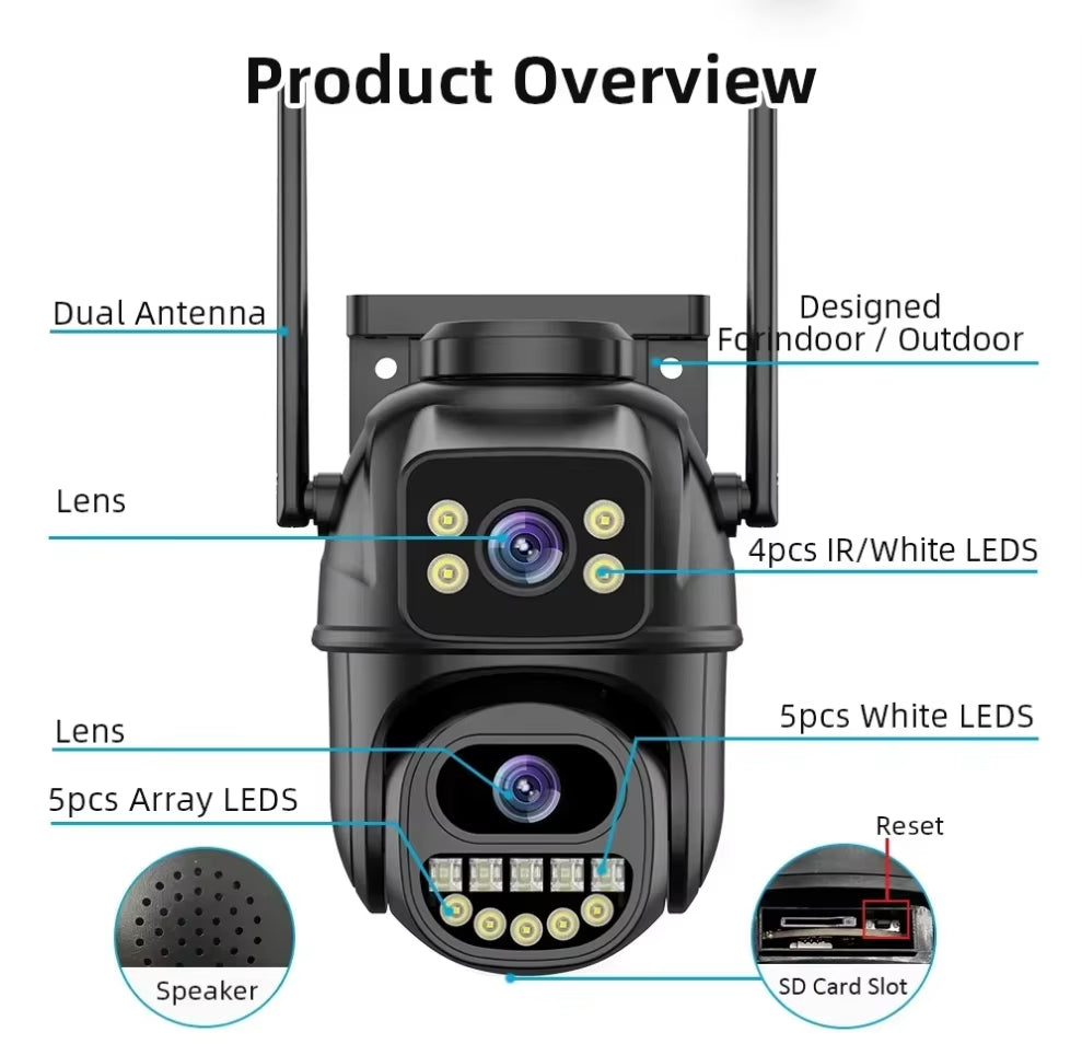 notice : EU plug & No SD card! Description 4K 8MP/10MP Dual Screens Outdoor Wifi Surveillance Camera ① Camera has... Read more Read more