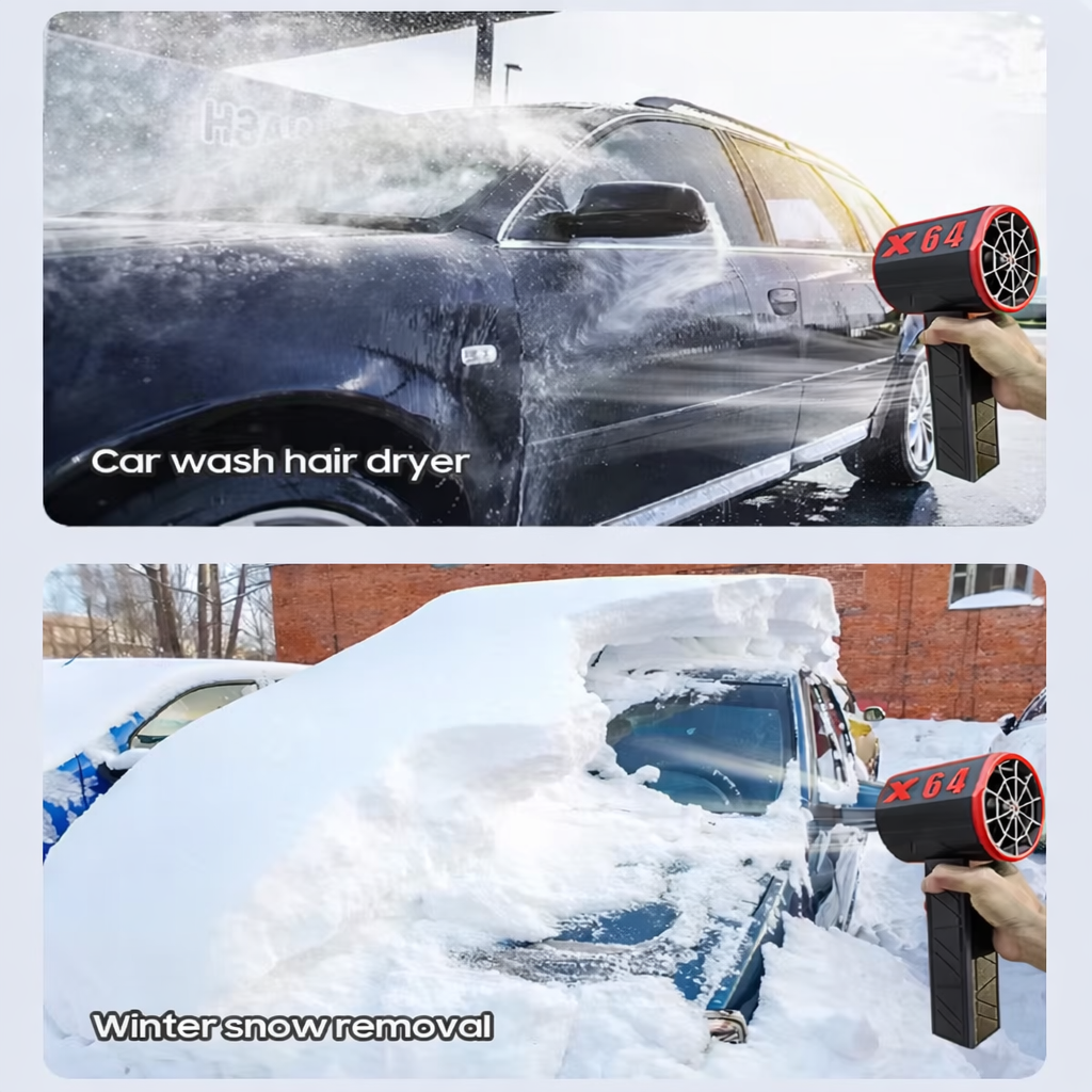 New appearance design: Reasonable structure and powerful performance. This product adopts a high-speed 64mm brushless motor with 11 blade fan group, which has good dust removal effect and a thrust of up to 1400 grams. Suitable for: snow cleaning, air cushion inflation, rapid cooling, dust removal, yard cleaning, industrial dust removal, keyboard cleaning, car and motorcycle cleaning, car cleaning water collection, car crack cleaning, foot pad debris cleaning, etc. One household, commercial, and outdoor machine to handle